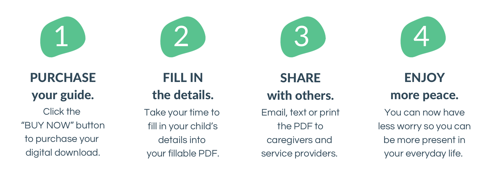Purchase and download your digital PDF guide. Collect the information you need and input it into the fillable PDF. Now you can print, email or text it to family members, caregivers, teachers, therapists, doctors and more.